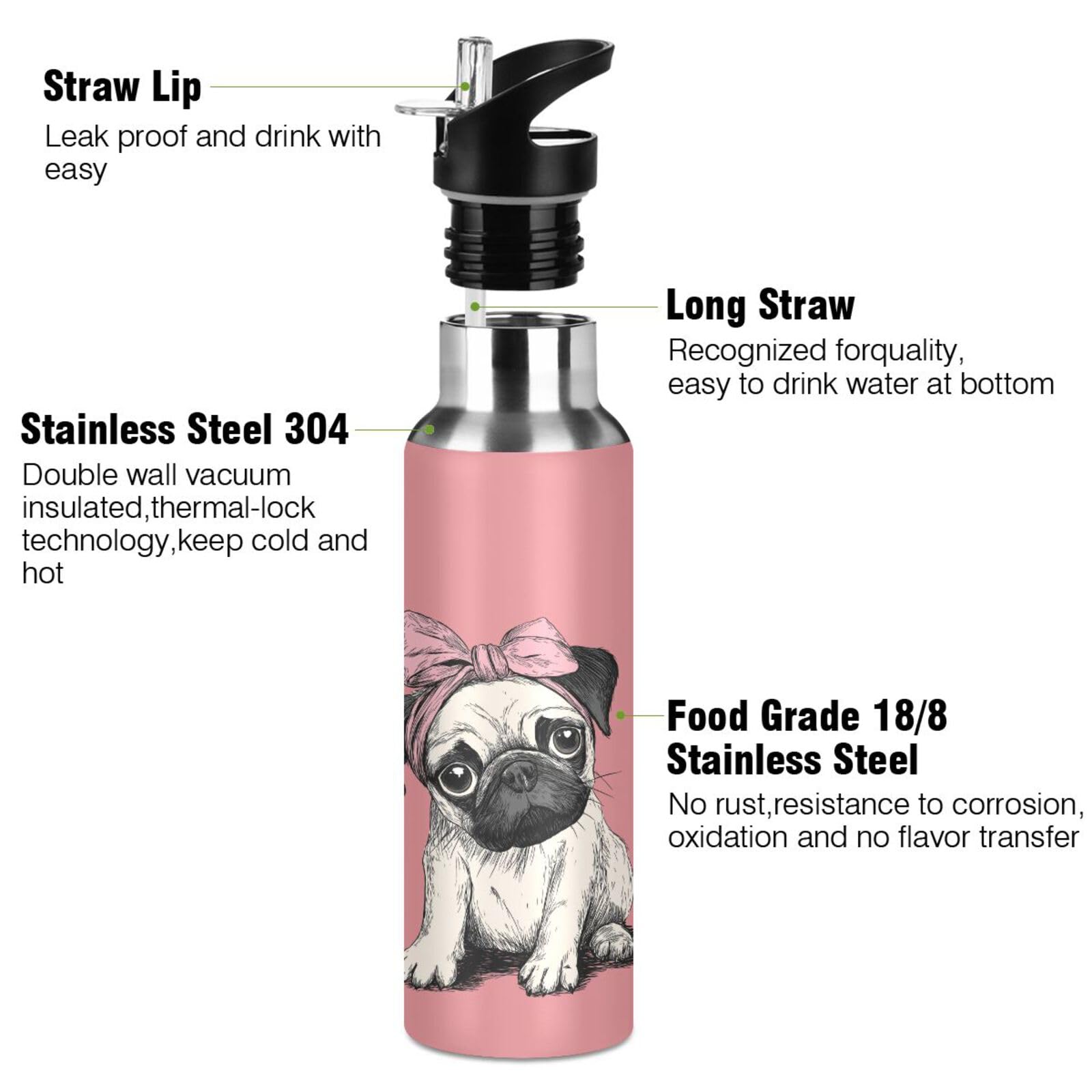 Blueangle 20 OZ Pink Headband Pug Water Bottle with Straw, Sports Water Bottle BPA Free Stainless Steel Water Jugs for Gym, Kitchen, Working, Outdoor