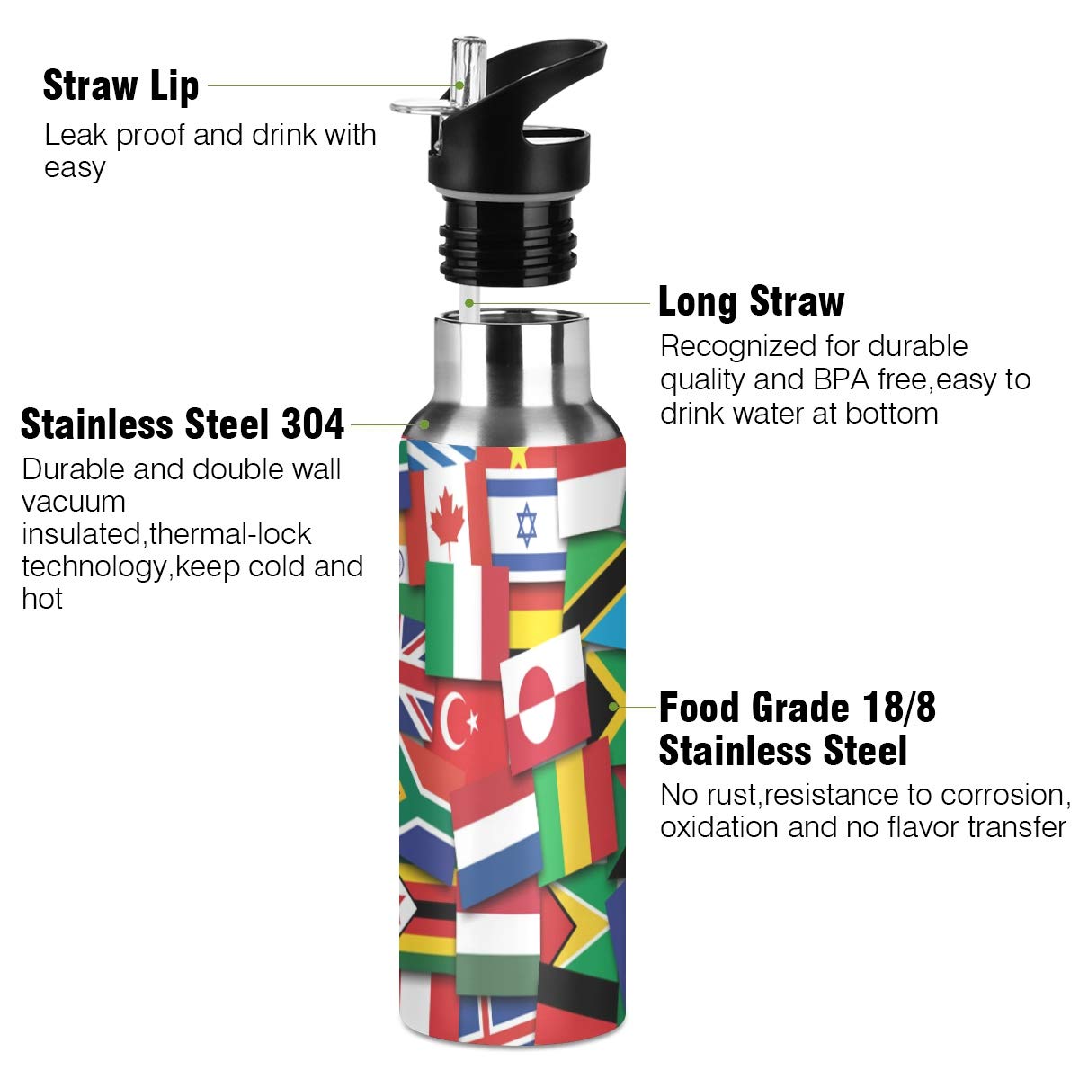 Blueangle 22oz World Flags Water Bottle, BPA Free Stainless Steel Water Bottle Leak-Proof Sports Bottle for Camping Workouts Gym and Outdoor Activity