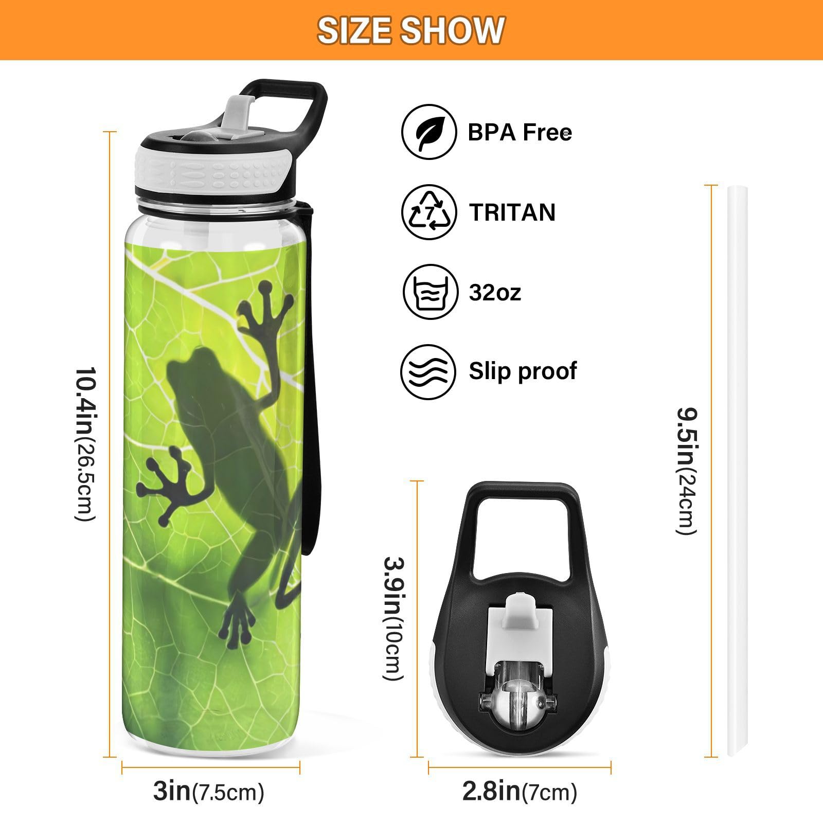 Blueangle Frog Shadow on Leaf Water Bottles, Reusable BPA Free Tritan Sports Bottle with Straw, Large Capacity Bottles for Daily Fitness, Gym, Running, Hiking